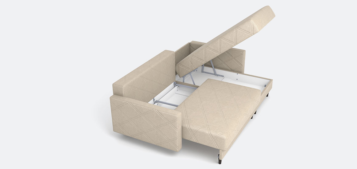 Вместительные бельевые ящики предусмотрены как в оттоманке, так и в раскладной секции — идеально для хранения постельных принадлежностей, пледов и других вещей.