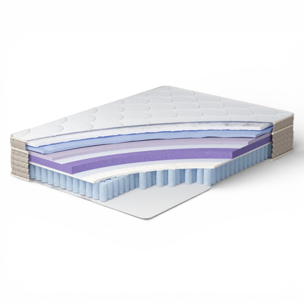 • Высокоплотный ППУ формирует стабильное и упругое основание. Этот слой гарантирует ровную поверхность для позвоночника и многолетнюю сохранность пружинного блока.